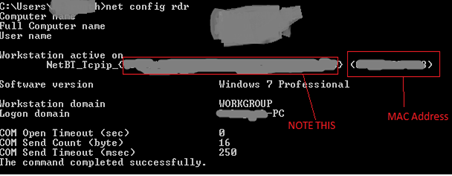 - Goto command prompt and type "net config rdr", and remember the number between the long number (GUID) inside the { }. For example, for MAC address "00C095ECB794," you should remember "{1C9324AD-ADB7-4920-B02D-AB281838647A}".